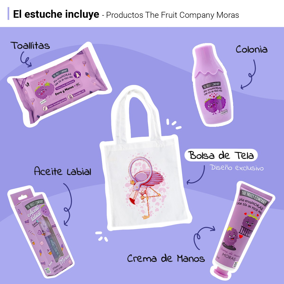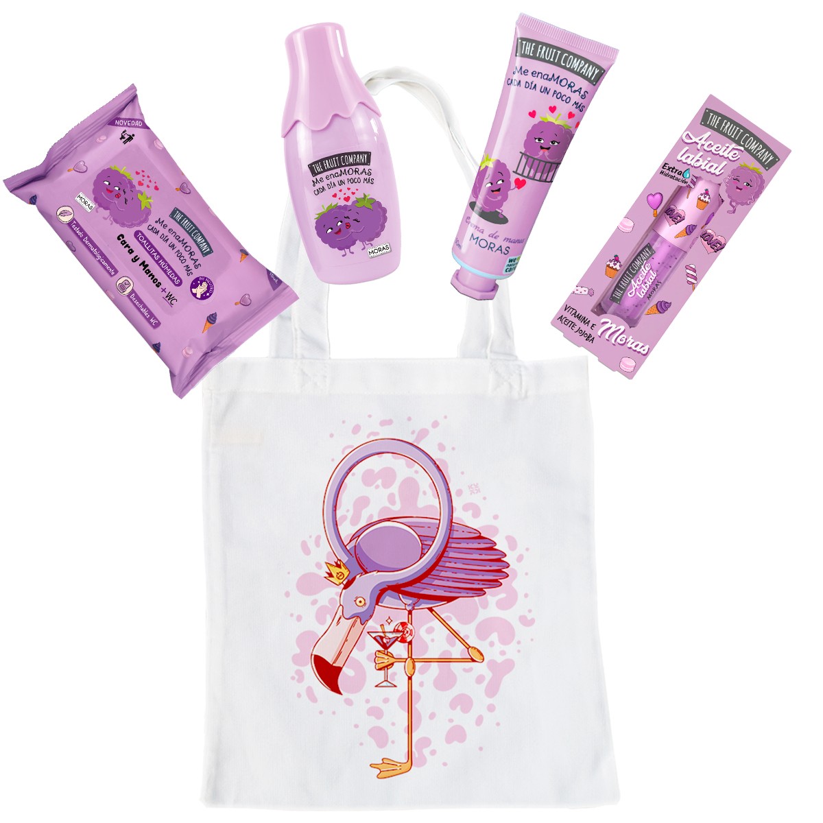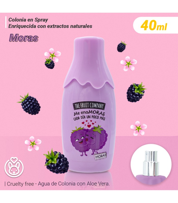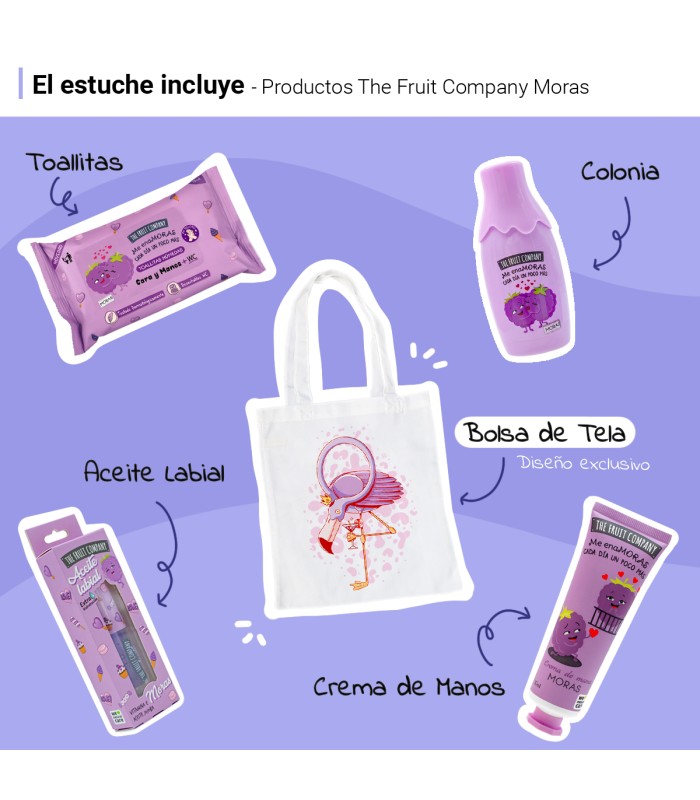 The Fruit Company Pack Regalo Moras con Bolsa de Tela Reutilizable, Colonia 40 ml, Crema de Manos, Aceite Labial y Toallitas