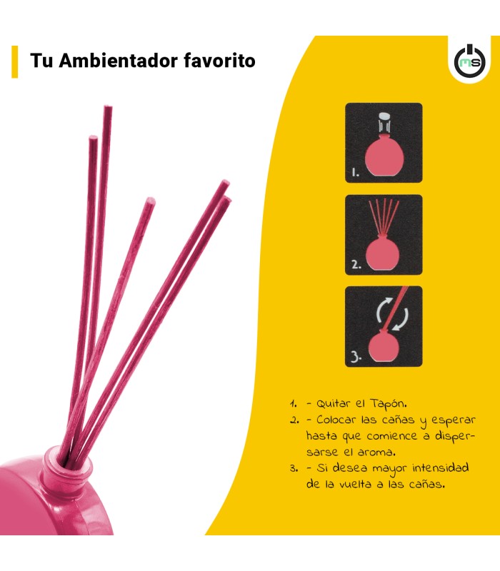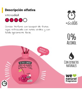 Ambientador mikado con aroma a cereza, extractos naturales y 0 % alcohol. Perfuma el hogar de forma continua durante más de 60 días, creando un ambiente frutal, alegre y con mucha personalidad. Formato 40 ml.