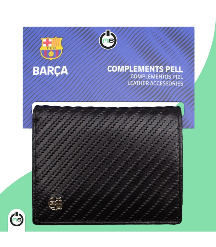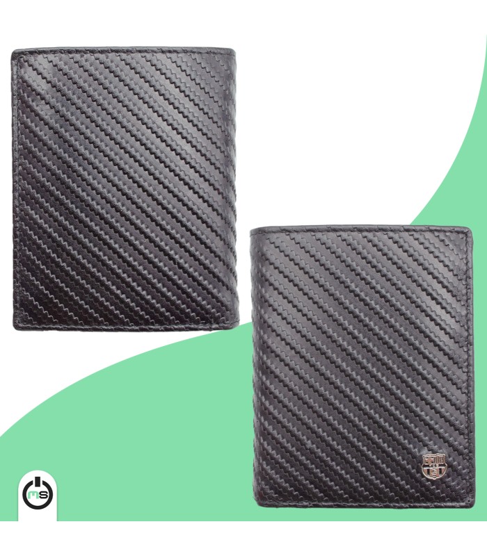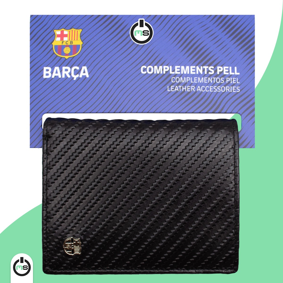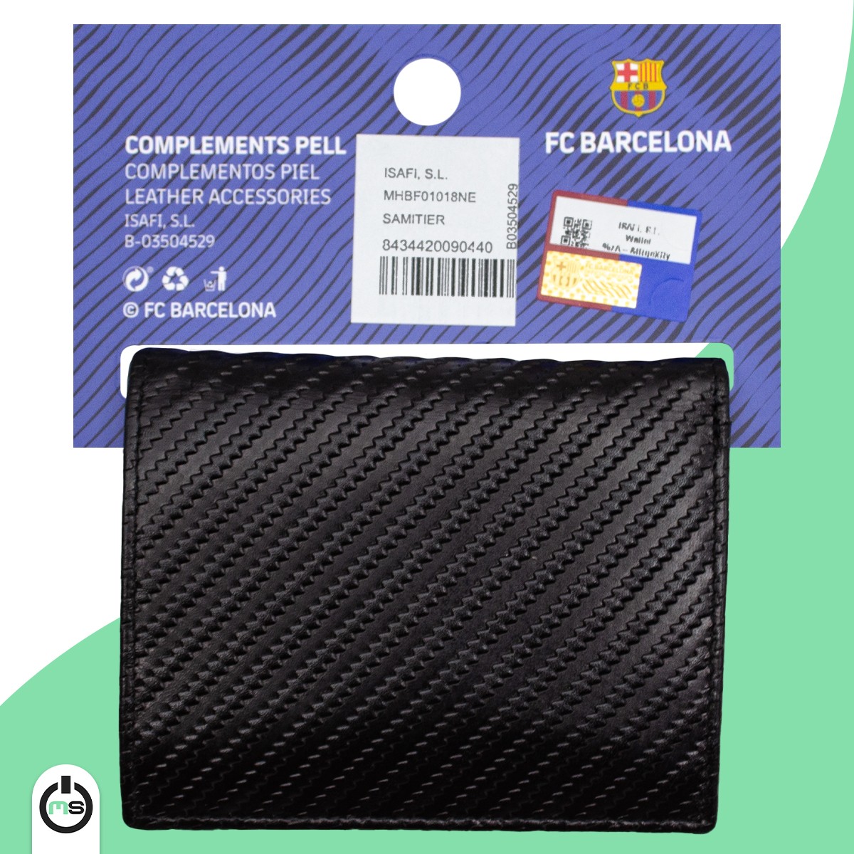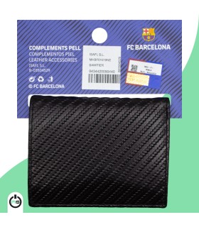 Cartera oficial FC Barcelona negra con acabado tipo fibra de carbono. Incluye tarjeteros, billetero y monedero con cierre. Elegante, resistente y perfecta para fans.