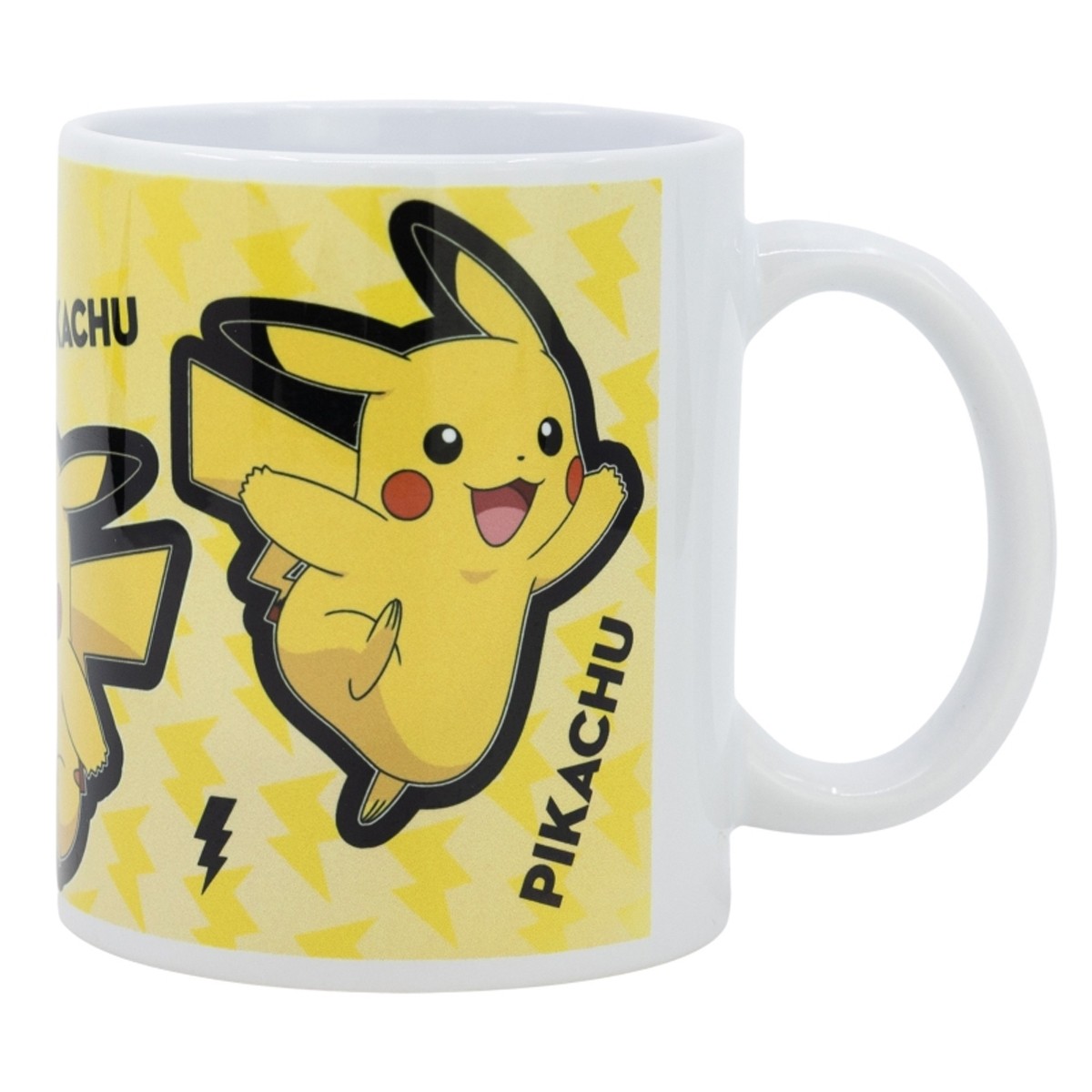 Taza oficial Pikachu 325 ml de cerámica marca Stor. Apta para microondas y lavavajillas. Diseño amarillo con múltiples Pikachus. Ideal para fans y coleccionistas Pokémon.