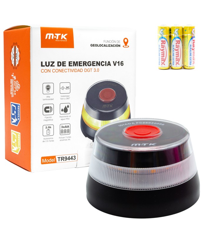 Luz Emergencia V16 Conectada DGT 3.0 | Homologada 2026 | LED 360º 1 km | IP54 | Base Magnética IoT 12 Años 3 Pilas AA Incluidas