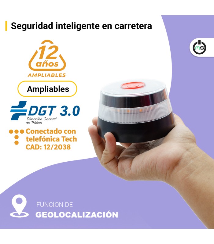 Baliza V16 conectada DGT 3.0 y homologada (obligatoria desde 2026). LED 360º visible 1 km, IP54, base magnética y 3 pilas AA incluidas. Conectividad IoT 12 años (servicio incluido hasta 2038). Señaliza tu vehículo sin salir del coche o moto.