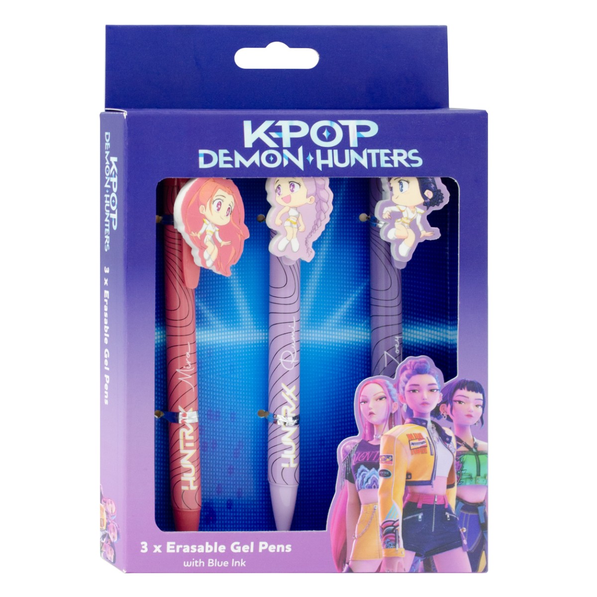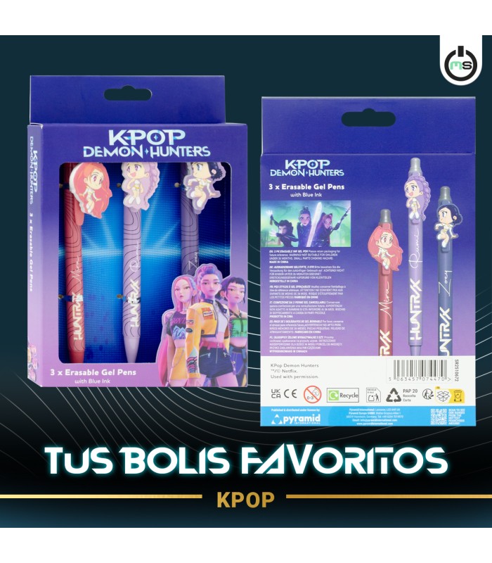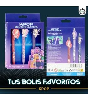 Pack de 3 bolígrafos de gel borrables K-Pop Demon Hunters de Pyramid International. Diseños exclusivos inspirados en el universo K-Pop. Tinta suave y borrable, ideal para estudiantes y fans de papelería creativa.